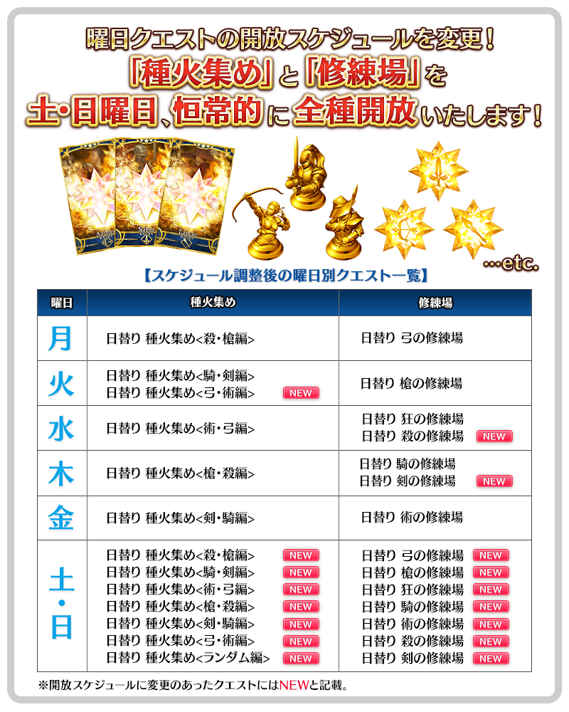 サーヴァントを育成しやすくなるように、土曜日と日曜日にすべての「種火集め」と「修練場」を恒常的に開放いたします!