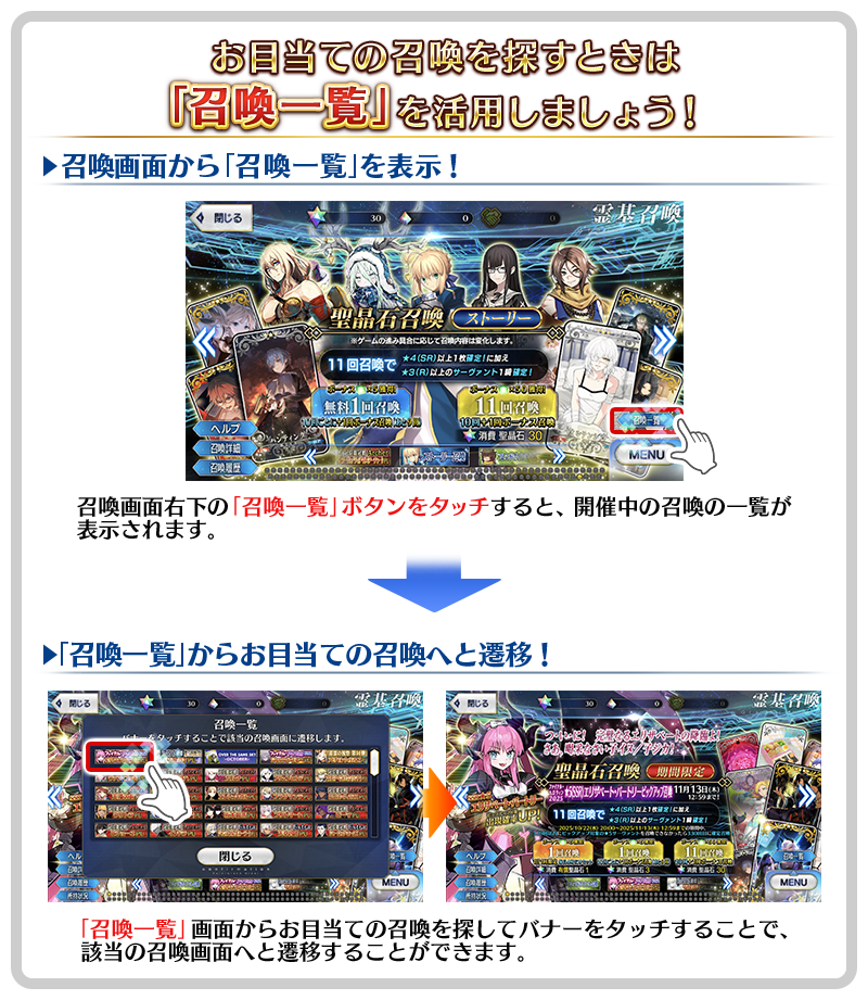 召喚画面右下の「召喚一覧」ボタンをタッチすると、開催中の召喚の一覧が表示されます。